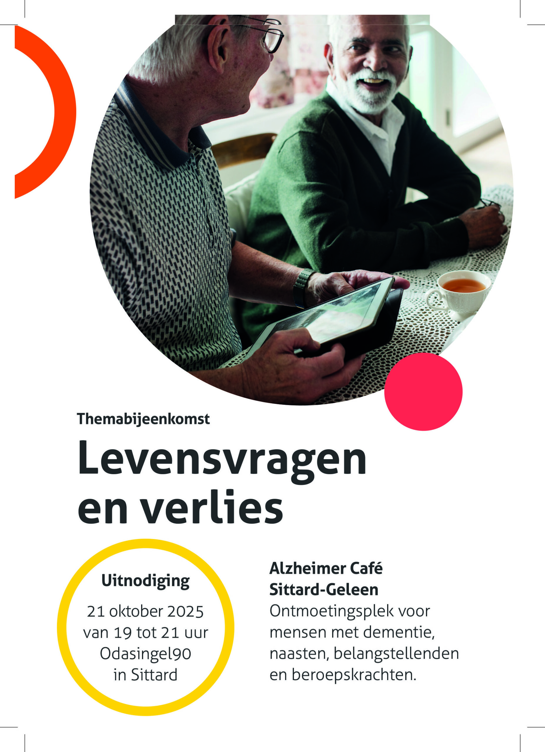 Bij geheugenproblemen is er ook sprake van verlies; zowel van vaardigheden als in relaties met anderen. Ook deze situatie kan levensvragen oproepen. Joris de Lange, geestelijk verzorger en zorgethicus bij Zuyderland Zorgcentra, geeft deze avond een voordracht over levensvragen en verlies. Inge Jochem, ketenregisseur Hulp bij Dementie/Ouderenzorg, sluit hierop aan door advies te geven hoe u wensen en behoeftes voor nu of voor later kunt (laten) vastleggen.